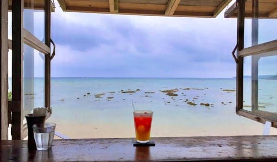 浜辺の茶屋を訪れると、入り口にいるシーサーが出迎えます。お店は屋上のテラス席、カフェ店内、ビーチのテラス席があります。店内の外観は木造りで、素朴な雰囲気を演出してくれます。席数が少なくこじんまりとしているので、木造りの外観とあいまってどこか隠れ家のような空気も感じさせます。ビーチには茅葺きの屋根があり、椅子スペースで飲食することができます。